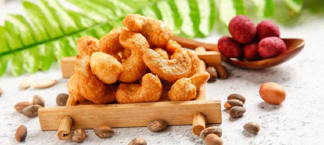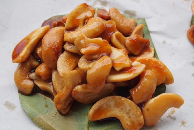 三、蜜汁腰果蜜汁腰果以腰果、麦芽糖为主料,以红糖为辅料制作而成。难易指数:★★制作步骤:1、腰果洗净备用2、锅内添加适量的清水,添加红糖、麦芽糖,烧开煮成糖水3、加入腰果,小火熬煮,边煮边搅拌4、待腰果煮好入味,捞出晾凉5、炒锅烧热倒入食用油,放入腰果炸6、油炸过程中要不停翻动,待炸至金黄色即可7、腰果捞起晾凉后即可食用蜜汁腰果酥脆香甜,在餐桌上也是一道亮丽的风景哦!