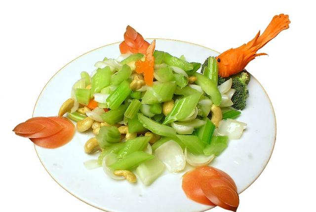 四、腰果炒西芹腰果炒西芹主要以西芹、腰果、枸杞为材料制作而成。难易指数:★★制作步骤:1、腰果洗净备用,西芹洗净切段,枸杞用水浸泡2、锅烧热倒入油,加入西芹翻炒3、放入枸杞,添加适量盐继续翻炒4、最后加入腰果翻炒至熟即可腰果炒西芹做起来很简单,这种吃法可以是日常吃法,做做试试呗。